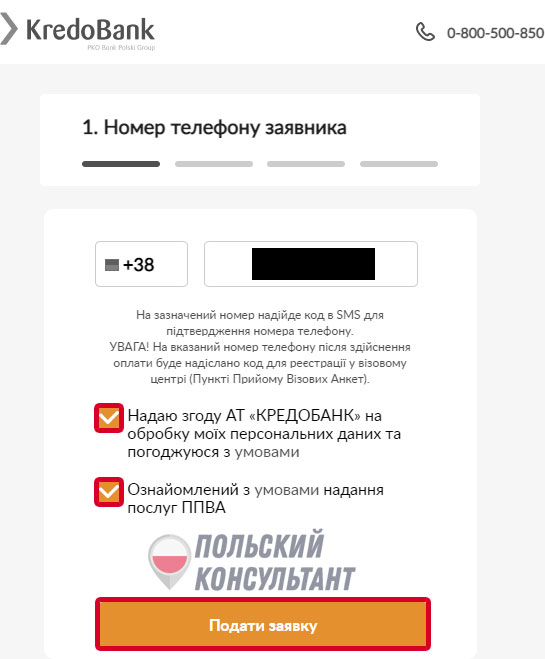 - Введите действующий номер телефона и поставьте две галочки напротив полей с согласием на обработку данных и правилами сервиса. Нажмите «Подати заявку».