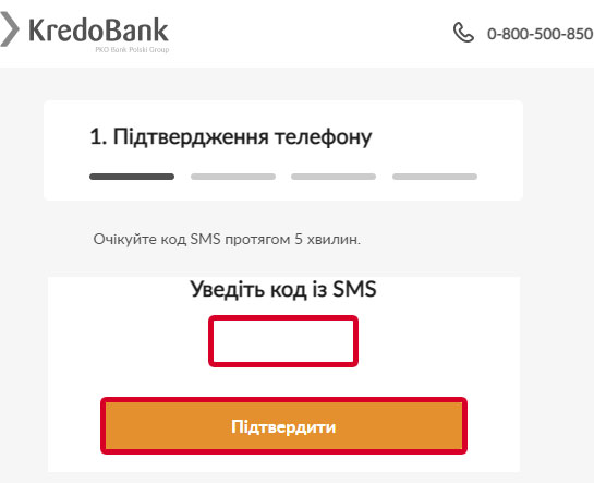 - Дождитесь СМС с кодом подтверждения, который и введите в открывшееся поле. Кликните по «Пiдтвердити».