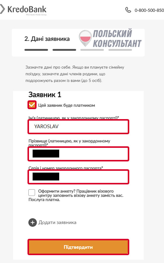 - Если необходимо ввести членов семьи, кликните по «Додаты заявника» и повторите ввод данных. Подтвердите операцию.