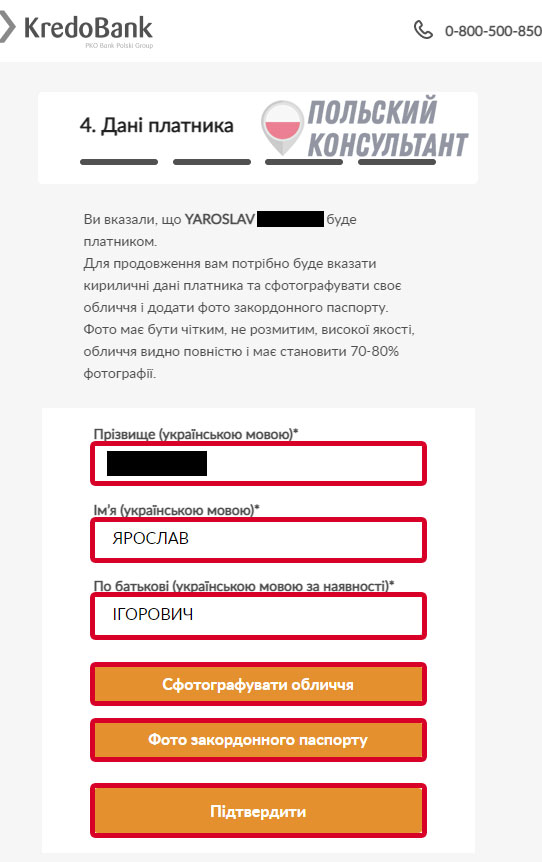 - Введите ФИО по-украински в соответствии с написанием во внутреннем паспорте.
